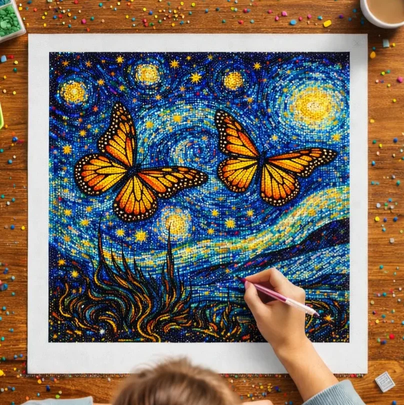 Pintura de diamantes mariposa con noche estrellada 40×40 cm, diseño brillante y mágico que une naturaleza y cielo nocturno. Ideal para decorar y disfrutar del arte DIY creativo.